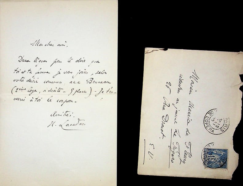 Henri Lavedan (1859-1940), écrivain, journaliste, membre de l'Académie française. L.A.S. + enveloppe, 2 mai 1890, 1p in-8. Au docteur et écrivain Maurice de Fleury (1860-1931). Envoi d'une loge, probablement pour sa pièce Une famille qui sera créée le 17 mai 1890 à la Comédie-Française. Les Fleury seront avec les Bruneau, certainement le compositeur Alfred Bruneau et son épouse. [454]