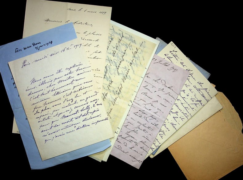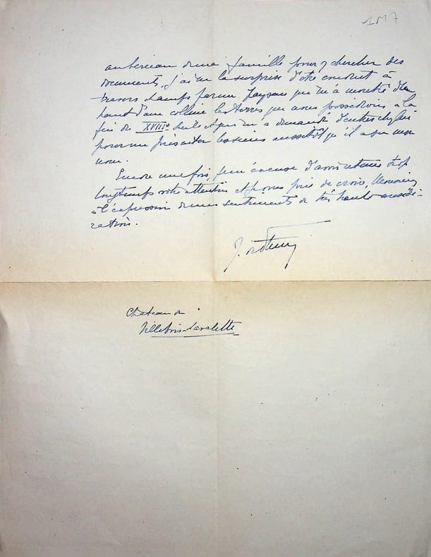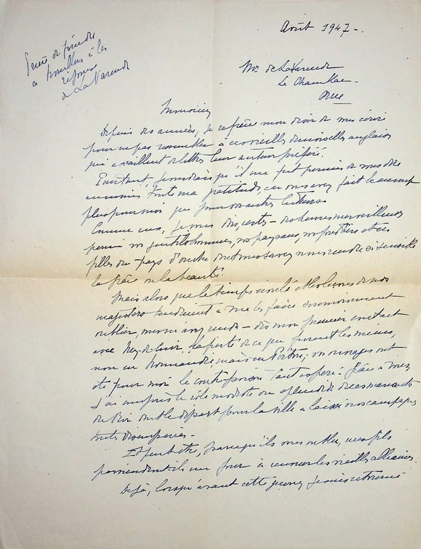 [Jean de La Varence] Jean de Fleury (1890-1967), fils du médecin et écrivain Maurice de Fleury. L.A.S., août 1947, 1p 1/2 in-4. A l'écrivain Jean de La Varende (1887-1959) (lettre jamais envoyée provenant des papiers de la famille Fleury). Belle lettre d'un lecteur à son écrivain favori. On joint divers papiers provenant de Maurice de Fleury et un devoir de philosophie de Jean. [455]