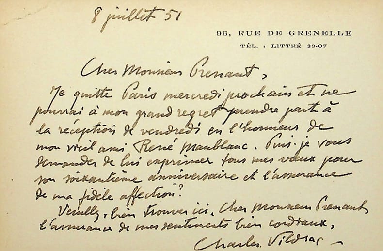 Charles Vildrac (1882-1971), poète, fondateur du groupe de l'Abbaye. L.A.S., 8 juillet 1951, 1p in-12. A Marcel Prenant (1893-1983), zoologiste, homme politique, proche de René Maublanc. Il ne peut venir à la réception pour les 60 ans de l'écrivain René Maublanc (1891-1960). [459]