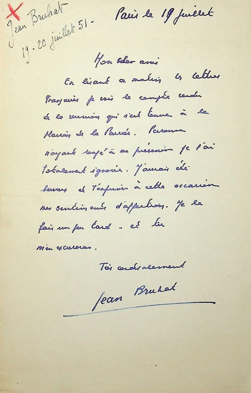 Jean Bruhat (1905-1983), historien, communiste. L.A.S., 19 juillet 1951, 1p in-8. A René Maublanc (1891-1960), philosophe, écrivain, antifasciste. Courrier amical pour les 60 ans de Maublanc, regrettant de ne pas avoir été mis au courant de la réunion pour fêter l'anniversaire. [459]