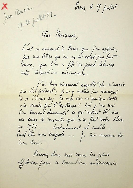 Jean Suret-Canale (1921-2007), géographie, historien, militant communiste. L.A.S. « J Canale », 19 juillet 1951, 1p 1/4 in-8. A René Maublanc (1891-1960), philosophe, écrivain, antifasciste. Courrier amical pour les 60 ans de Maublanc, il regrette d'avoir raté la réunion pour fêter cet anniversaire. [459]