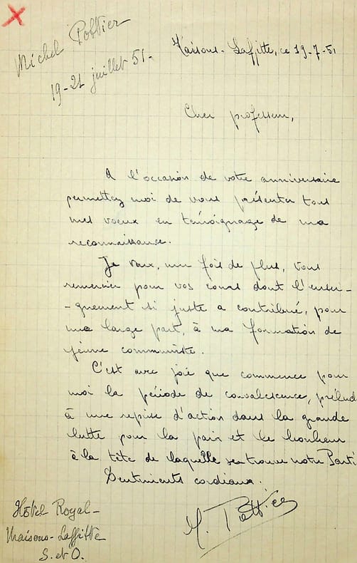 Michel Pottier (1930-2018), professeur des Université, militant communiste. L.A.S., 19 juillet 1951, 1p in-8. A René Maublanc (1891-1960), philosophe, écrivain, antifasciste. Courrier amical pour les 60 ans de Maublanc, qui était son professeur, signalant que son « enseignement si juste a contribué pour une large part à [sa] formation de jeune communiste ». [459]