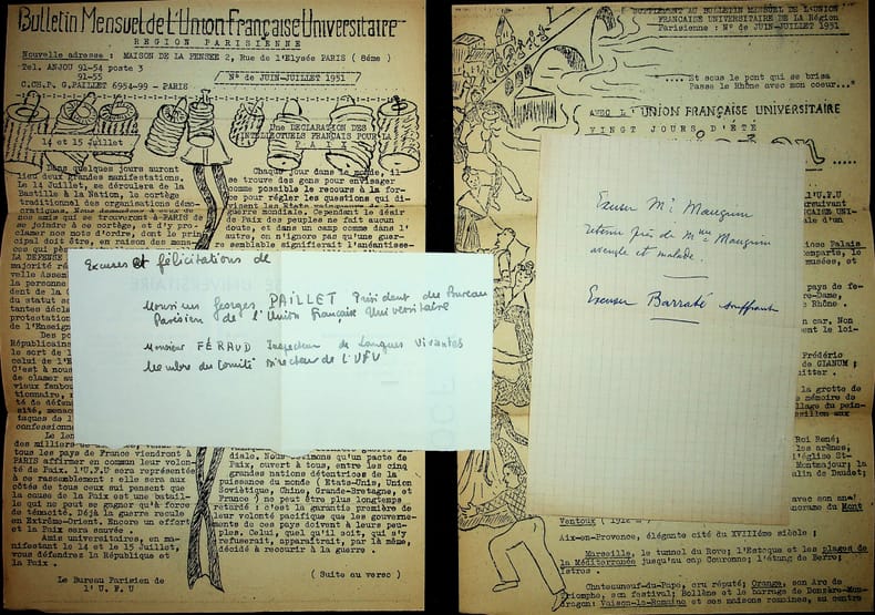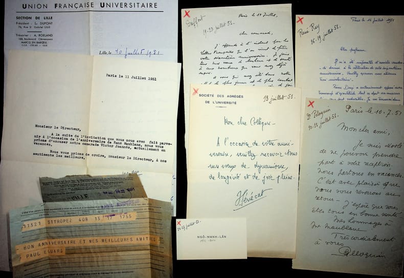 [René Maublanc (1891-1960), philosophe, écrivain, antifasciste] ensemble de courriers reçus. 8 courriers reçus en 1951 autour de son 60e anniversaire : Hénécat(?), Ngô-Manh-Lân, Paul Eluard (télégramme), Duffort, René Rey (un de ses élèves), docteur Pelloquin, J Massoni et Lucien Dupont. On joint quelques papiers de la même période. [459]