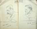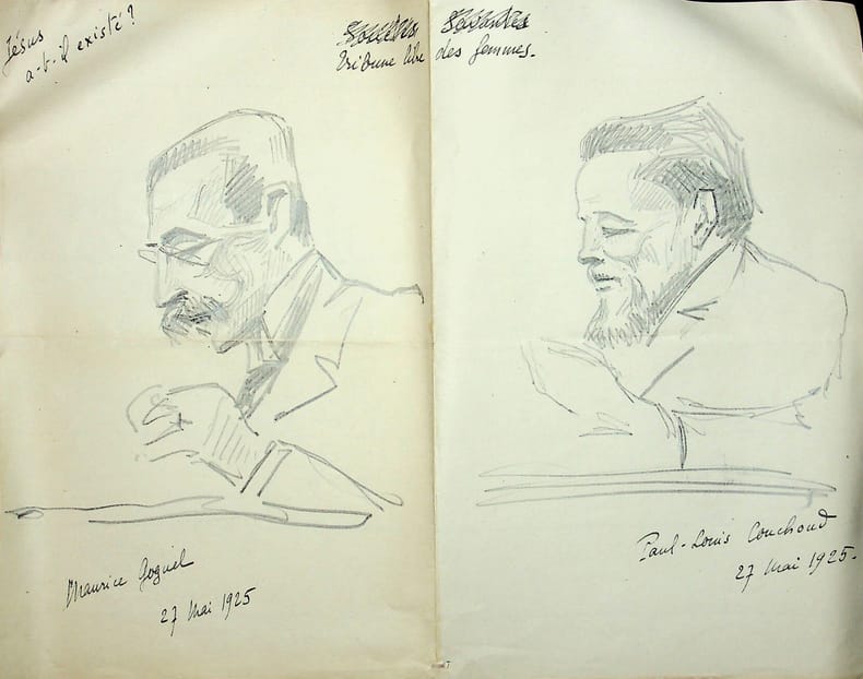 René Maublanc (1891-1960), philosophe, écrivain, antifasciste. Dessin original, 27 mai 1925, 1P in-4. Portraits du professeur Maurice Goguel (1880-1955) et du philosophe Paul-Louis Couchoud (1879-1959). Note « tribune libre des femmes » et « Jésus a-t-il existé ? ». [461]