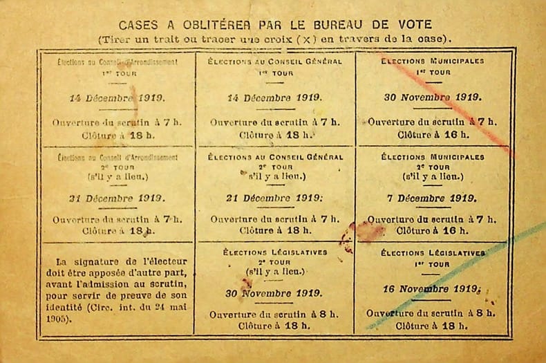 René Maublanc (1891-1960), philosophe, écrivain, antifasciste. P.S. Carte d'électeur : valable uniquement pour l'élection d'un conseiller d'arrondissement à Reims, signée par Maublanc. Coins coupés, probablement pour justifier le vote. [202]