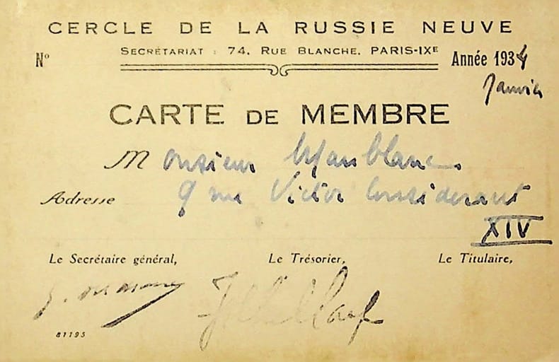 René Maublanc (1891-1960), philosophe, écrivain, antifasciste. Cercle de la Russie neuve : carte de membre pour 1932 signée par Gabrielle Duchêne, secrétaire général, et par le trésorier. [237]