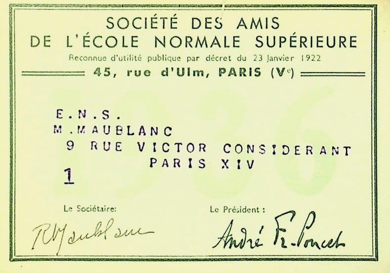 René Maublanc (1891-1960), philosophe, écrivain, antifasciste. P.S. Société des Amis de l'Ecole Normale Supérieure : carte de membre, sans date (ap. 1922), signée par Maublanc. Petite déchirure en haut. [299-3]