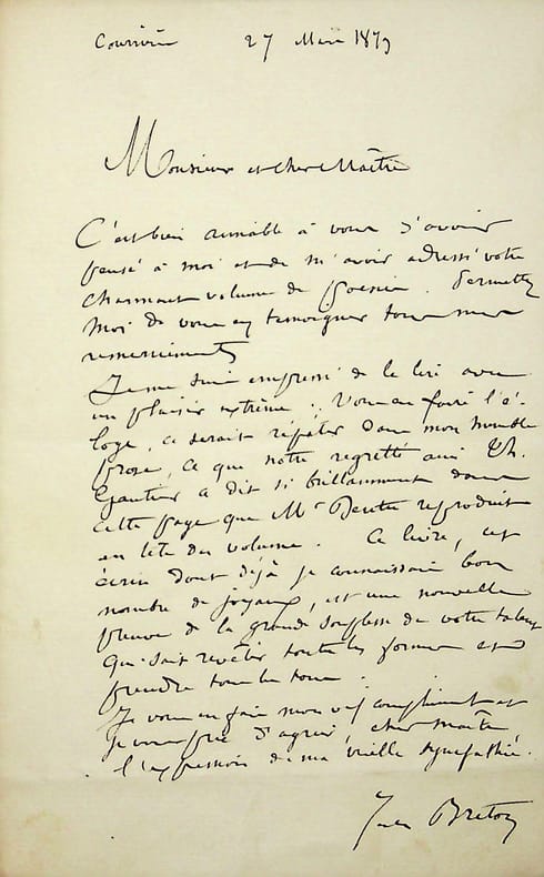 Jules Breton (1827-1906), peintre, poète. L.A.S., Courrières, 27 mai 1879, 1p in-8. Belle lettre de remerciements à un poète pour son recueil de poésies, publié chez Dentu et portant une reproduction d'une poésie de Théophile Gautier. « Ce livre est un écrin dont déjà je connaissais bon nombre de joyaux, est une nouvelle preuve de la grande souplesse de votre talent qui sait revêtir toutes les formes et prendre tous les tons ». [462]