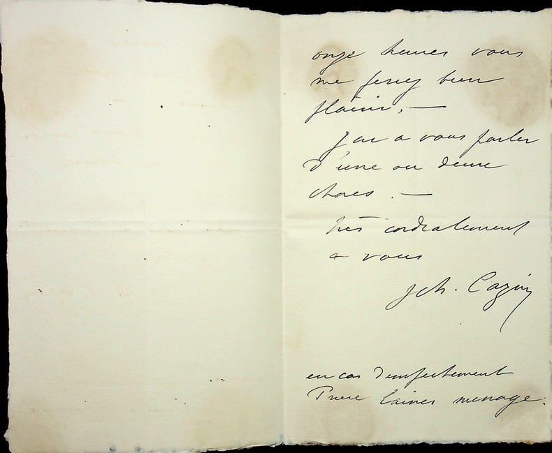 Jean-Charles Cazin (1841-1901), peintre, graveur, céramiste. L.A.S., 19 janvier 1891, 2p in-8. Il a été malade et souhaite voir son correspondant le lendemain. Traces de collage au dos du 2e feuillet. [462]