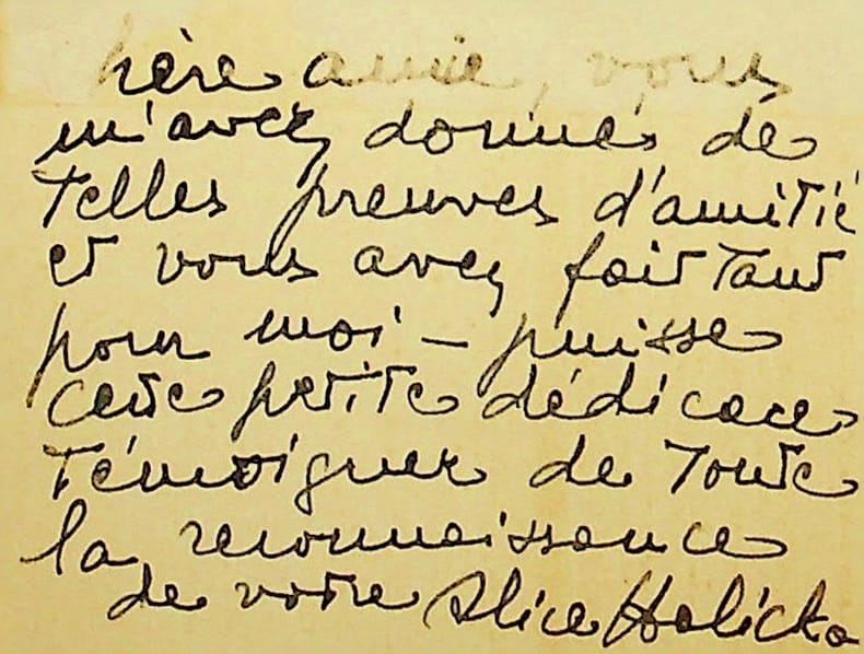 Alice Halicka (1889-1974), peintre polonaise naturalisée française. C.A.S., sd, 1p in-16. « Chère ami, vous m'avez donné de telles preuves d'amitié et vous avez tant pour moi - puisse cette petite dédicace témoigner de toute la reconnaissance de votre Alice Halicka ». Encre éclaircie en haut (suite à un scotch retiré ?). Peu commun. [462]