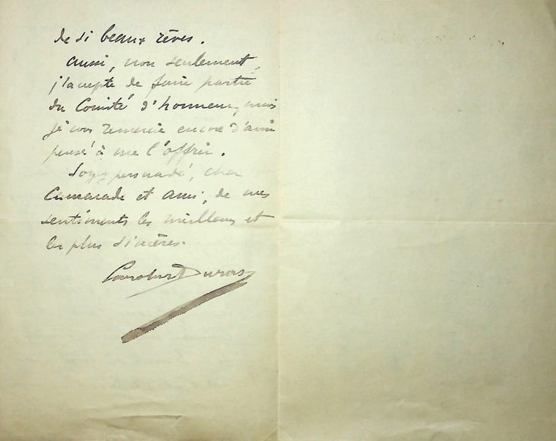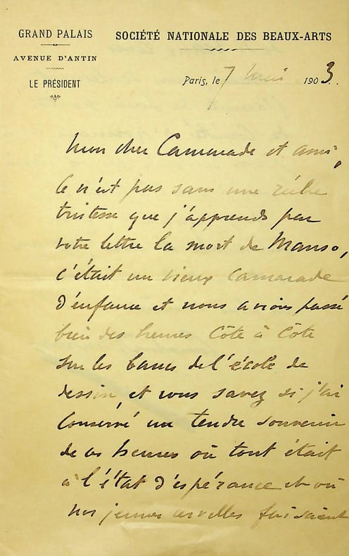 Charles Durant dit Carolus-Duran (1837-1917), peintre, sculpteur. L.A.S., Paris, 7 mai 1903, 2p in-8. Belle lettre à un ami qui vient de lui annoncer la mort du poète Charles Manso (1835-1903). Carolus-Duran, qui l'a connu à l'école, accepter d'être président du comité d'honneur de Manso. Belle lettre. [462]