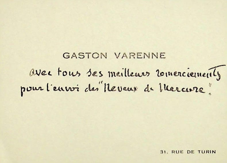 Gaston Varenne (1872-1949), peintre, graveur, écrivain. C.A., sd [1936], 2 lignes. A l'écrivain Jean de Cordestieux. « avec tous ses meilleurs remerciements pour l'envoi des "Neveux de Mercure" ». [462]