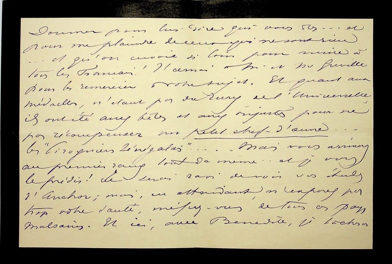 Jean-Joseph Benjamin-Constant (1845-1902), peintre, graveur. L.A.S., Paris, 8 août 1900, 4p in-8. Au peintre Marius Perret (1851-1900). Belle et longue lettre amicale, mentionnant l'inhospitalité française dans les Colonies, où est Perret. Il va écrit à Paul Doumer, alors gouverneur général de l'Indochine, pour lui dire qui est Perret. « et quant aux médailles, n'étant pas du jury de l'Universelle, ils ont été assez bêtes pour ne pas récompenser un petit chef d'oeuvres. les "Piroguiers sénégalais". mais vous arriverez aux premiers rangs tout de même ». Léonce Bénédite et lui tâcheront de faire reconnaître le talent de Perret. Belle lettre. [462]