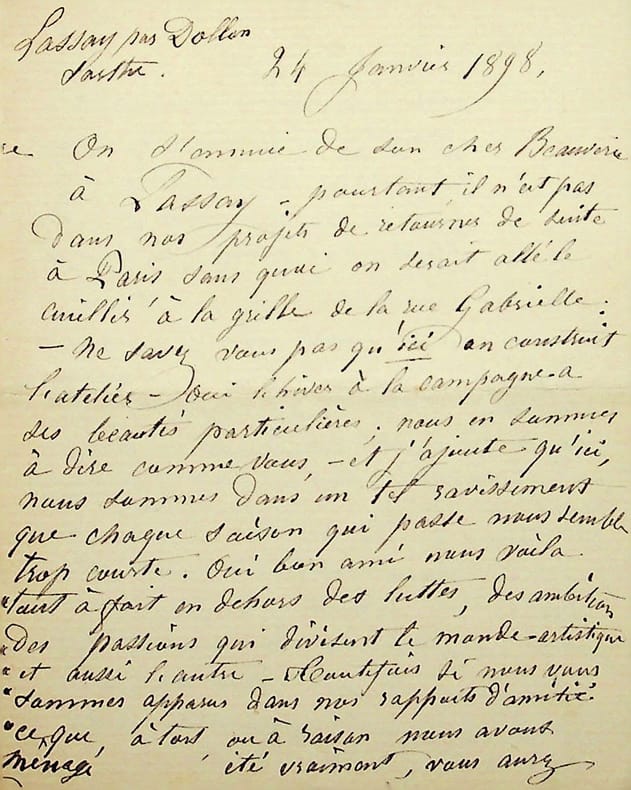 Hélène Bertaux (1825-1909), sculptrice, dite « Madame Léon Bertaux », fondatrice de Union des femmes peintres et sculpteurs. L.A.S., [Château de] Lassay par Dollon (Sarthe), 24 janvier 1898, 4p in-12. Au peintre Charles Beauverie (1839-1923). Longue et belle lettre amicale, invitant le peintre à Lassay, mentionnant que « l'hiver à la campagne a ses beautés particulières », que les travaux de son atelier se terminent, etc. Rare autographe. [462]