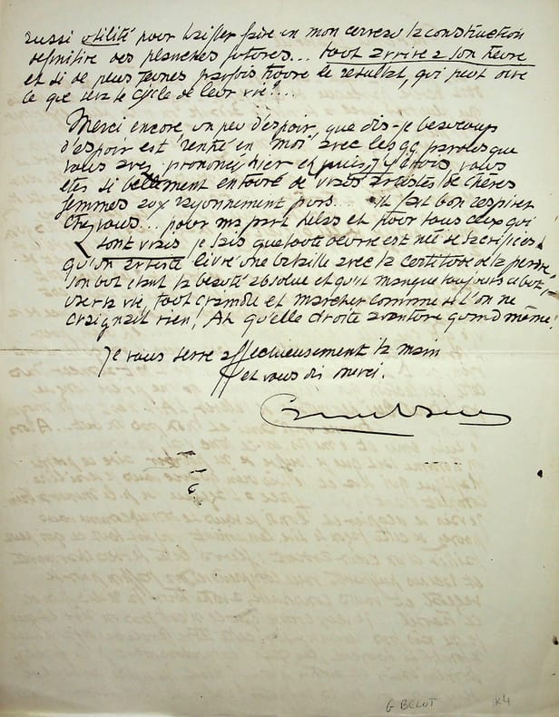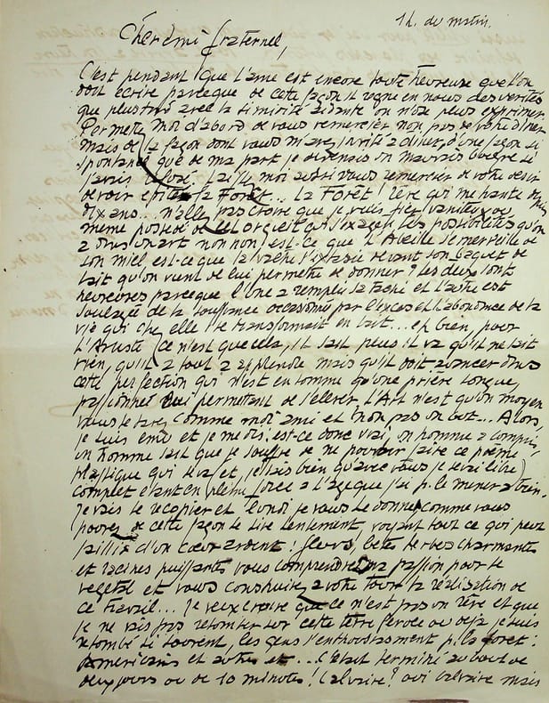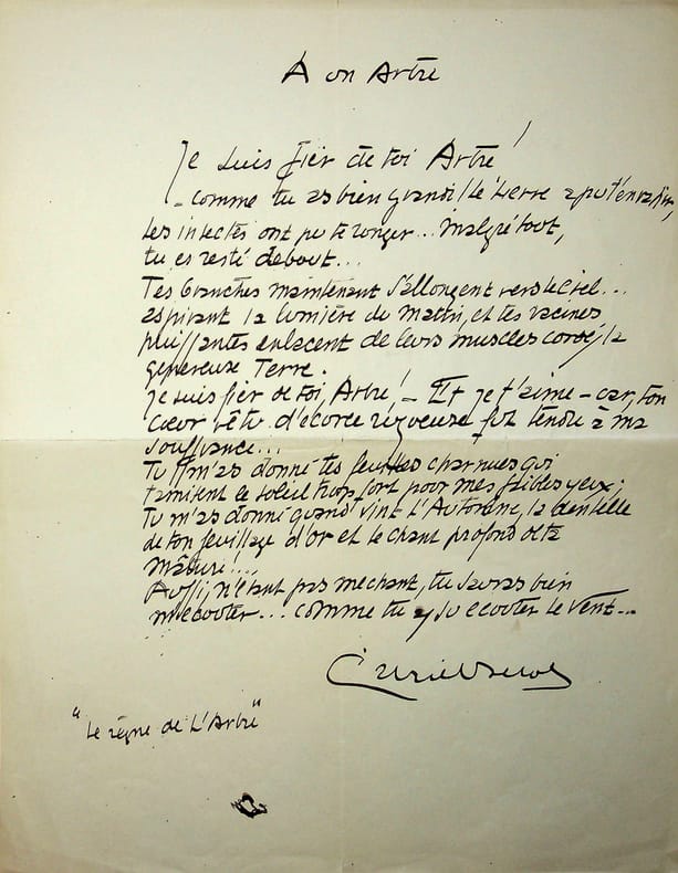 Gabriel Belot (1882-1962), peintre, poète, graveur. L.A.S. + Poème A.S., sd, 2p 1/2 in-4. Longue lettre, pleine de poésie, écrite à 1h du matin au retour d'un dîner chez son correspondant, parlant de forêt, annonçant un poème qu'il va recopier. On joint le-dit poème, titré « A un arbre ». Bel ensemble. [462]