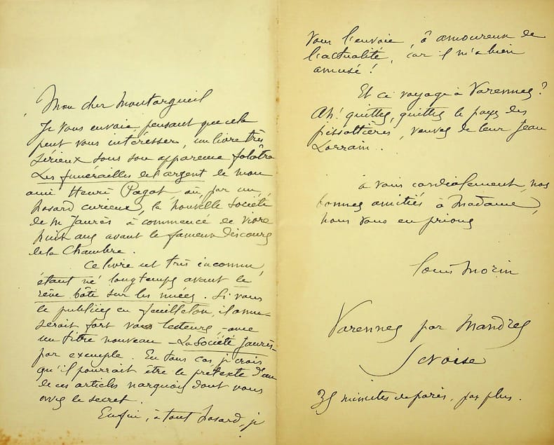 Louis Morin (1855-1938), peintre, caricaturiste, illustrateur. L.A.S., Varennes, sd [1897], 2p in-8. A l'écrivain Georges Montorgueil (1857-1933). Belle lettre pour lui recommander l'ouvrage Les Funérailles de l'Argent de son ami Henri Pagat. [463]