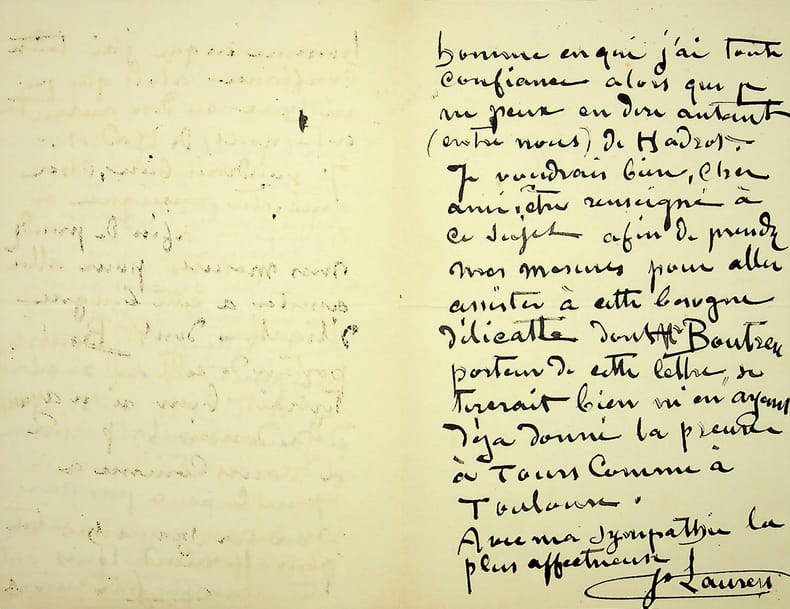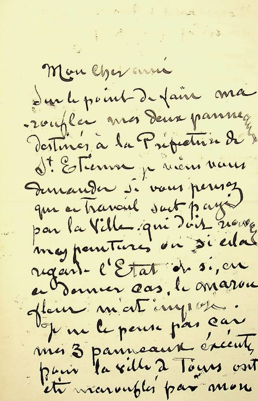 Jean-Paul Laurens (1838-1921), peintre, sculpteur. L.A.S., sd [1904?], 2p in-8. Il demande conseil à un ami pour le marouflage de deux panneaux destinés à la préfecture de Saint-Etienne. En fonction de qui payera, l'état ou la préfecture, le choix du maroufleur peut lui être imposé. Ces deux panneaux sont deux fresques représentant l'entrée de François Ier à Montbrison (daté 1901) et un paysage minier (daté 1904). Belle lettre. [463]