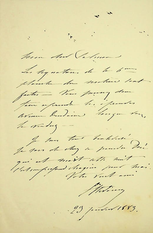 Lettre autographe signée de Victorien Sardou d'une page sans date, comportant seulement la mention mardi dans le coin supérieur droit. Elle est adressée à un certain Hennequin, peut-être Alfred Néocles dit Alfred Hennequin (1842-1887) dramaturge belge. Sardou charge Hennequin de lui "procurer deux exemplaires des Plaidoiries de Cléry (chez Lemerre)" les exemplaires de l'ouvrage étant introuvables il lui conseille de "s'adresser ailleurs et de payer plus cher au besoin". Si ces Plaidoieries, dont Lemerre fit paraître un recueil en 1890 intéressent à ce point Sardou c'est que l'on y trouve celle qui l'opposa à un certain Mario Uchard dans l'affaire connu sous le nom Fiammina contre Odette. Sardou fut accusé de plagiat par Uchard. L'accusateur fut débouté, le tribunal jugeant que la publication d'Odette vingt ans après la parution de La Fiammina ne pouvait nuir à Uchard bien que le sujet soit très proche. Sardou évoque ensuite son départ pour Nice où il possédait un pied à terre : la fameuse "Villa Graziella".On joint :Du même - une seconde lettre autographe signée, 155 x 98, non datée. Il y est question de prendre rendez-vous avec un professionnel au sujet de son clavecin "je voudrais avant mon départ faire emporter mon clavecin".Du même - deux courtes missives sur une carte (66 x 115) et sur un papier de deuil (155 x 97) concernant des rendez-vous pris ou manqués.
