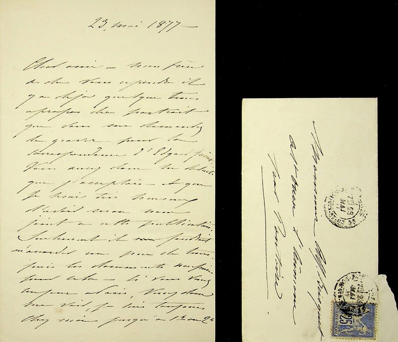 Edmond Hédouin (1820-1889), peintre, graveur. L.A.S. + enveloppe, 23 mai 1877, 2p in-8. A Alfred Busquet (1819-1883). A propos de la gravure d'un portrait d'Edgar Quinet pour sa correspondance qui doit être publiée (l'édition chez Germer-Baillière, publiée en 1877). Le projet n'a pas abouti à ce moment-là mais en 1880.