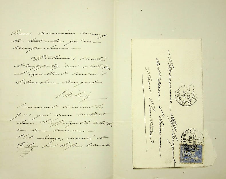 Lettre autographe signée du peintre Carolus-Duran (1837-1917), adressée à son ami Charles Dettelbach, puissant personnage siégeant au conseil d’administration de la Compagnie Minière franco-tunisienne dont l’épouse, cantatrice mondaine, tenait un salon musical et côtoyait Proust, Raynaldo Hann... Dans cette lettre Carolus s'excuse avec vivacité de ne pouvoir accepter l'invitation de son ami. Ainsi écrit-il : "voulant tâcher de me libérer. Pour cela je suis allé cet après-midi voir l'ami qui m'avait invité ; mais il m'a répondu qu'il avait invité pour moi plusieurs personnes qui viennent de Londres et qu'il se fâcherait [...] Voilà la situation [...] pour moi qui aurait été si heureux de vous dire : oui. "Pliures.