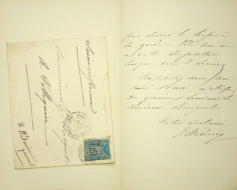 Lettre autographe signée du peintre Carolus-Duran (1837-1917), adressée à son ami Charles Dettelbach, puissant personnage siégeant au conseil d’administration de la Compagnie Minière franco-tunisienne dont l’épouse, cantatrice mondaine, tenait un salon musical et côtoyait Proust, Raynaldo Hann... Dans cette lettre Carolus s'excuse avec vivacité de ne pouvoir accepter l'invitation de son ami. Ainsi écrit-il : "voulant tâcher de me libérer. Pour cela je suis allé cet après-midi voir l'ami qui m'avait invité ; mais il m'a répondu qu'il avait invité pour moi plusieurs personnes qui viennent de Londres et qu'il se fâcherait [...] Voilà la situation [...] pour moi qui aurait été si heureux de vous dire : oui. "Pliures.