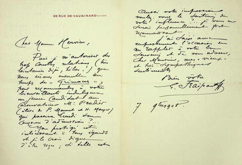 Gustave Fraipont (1849-1923), peintre, sculpteur, affichiste. L.A.S., 7 novembre 1908, 1p 1/2 in-8. A l'écrivain Paul Hervieu (1857-1915). Belle lettre recommandant un candidat au Conservatoire, Pierre Pradier (1891-1936), élève de Paul Mounet et Henry Mayer, deux acteurs bien connus d'Hervieu. Ils ont notamment créé des rôles pour Le Dédale d'Hervieu. Pradier entre au Conservatoire en 1909.