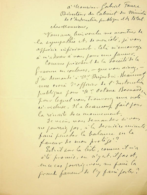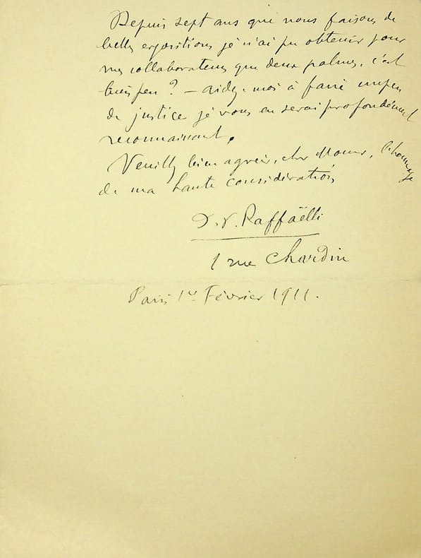 Jean-François Raffaëlli (1850-1924), peintre, sculpteur, graveur. L.A.S., Paris, 1er février 1911, 1p 1/2 in-8. À l'écrivain Gabriel Faure (1877-1962). Il demande son aide pour obtenir une croix d'officier de l'Instruction Publique pour Octave Bernard (1869-1953). Il le fait comme président de la Société de la gravure originale en couleurs, cofondé par Bernard et Raffaëlli.