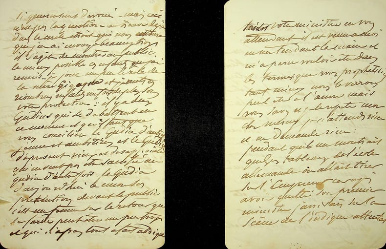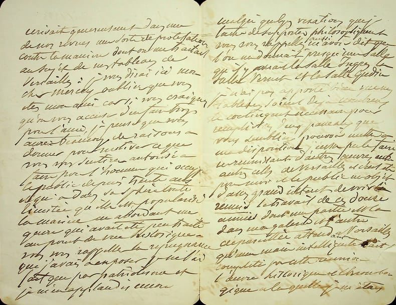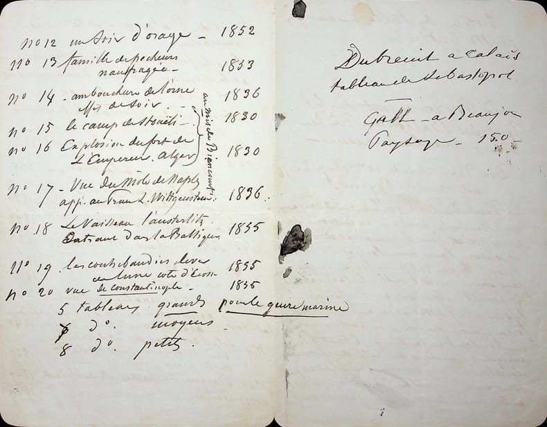 Théodore Gudin (1802-1880), peintre, premier titulaire du titre de peintre officiel de la Marine (conjointement avec Crépin). L.A.S. à la troisième personne, 14 avril 1851, 3p in-8. Au peintre Frédéric Bourgeois de Mercey (1803-1860) (non mentionné). Très belle lettre à propos des tableaux qu'il avait faits pour le musée de Versailles (château de Versailles) sur une commande de la liste civile de 1839. Sur ces 90 tableaux, 63 sont arrivés au musée avant la révolution mais les 27 autres sont restés propriété de Louis Philippe. Etant mis en vente, il souhaite que ces tableaux soit acquis pour rejoindre le musée. Il semble que ces tableaux ont bien été acquis pour le musée. Très belle lettre.