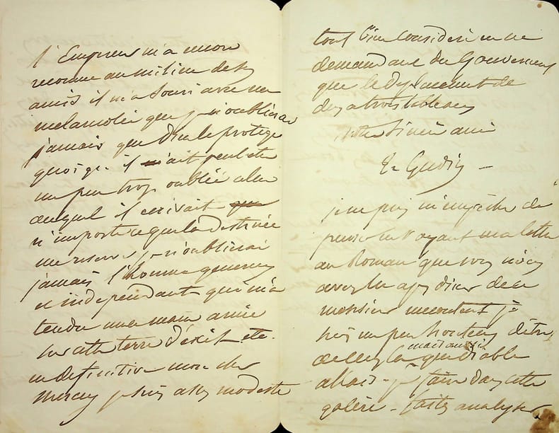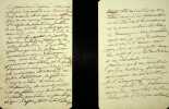 Théodore Gudin (1802-1880), peintre, premier titulaire du titre de peintre officiel de la Marine (conjointement avec Crépin). L.A.S., Beaujeu, 29 avril 1855, 11p in-8. Au peintre Frédéric Bourgeois de Mercey (1803-1860). Très longue lettre sur sa peintre, notamment les 90 oeuvres peintes pour le musée (château) de Versailles. Il donne aussi une liste de 20 oeuvres. Beau document.