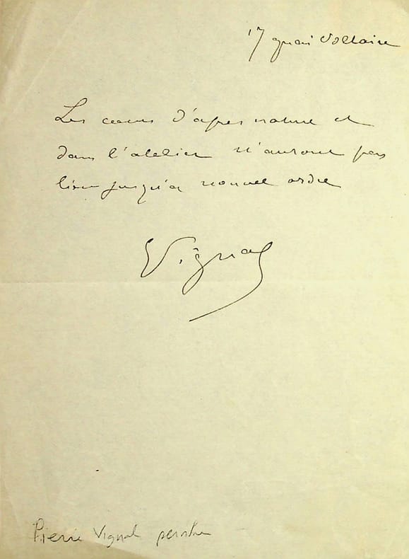 Pierre Vignal (1855-1925), peintre. L.A.S., sd, 1/2p in-12. « Les cours d'après nature et dans l'atelier n'auront pas lieu jusqu'à nouvel ordre ».