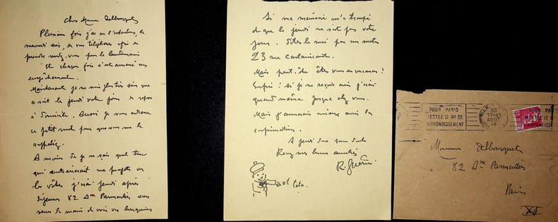Raoul Guérin (1890-1984), dessinateur humoristique. L.A.S. avec petit dessin, 30 juin 1946, 2p in-8. A Jean Delbousquet dit Jean de Cordestieux. Longue lettre pour fixer un rendez-vous, lui rendre des ouvrages, donnant des nouvelles. Petit dessin de Toto à la fin.