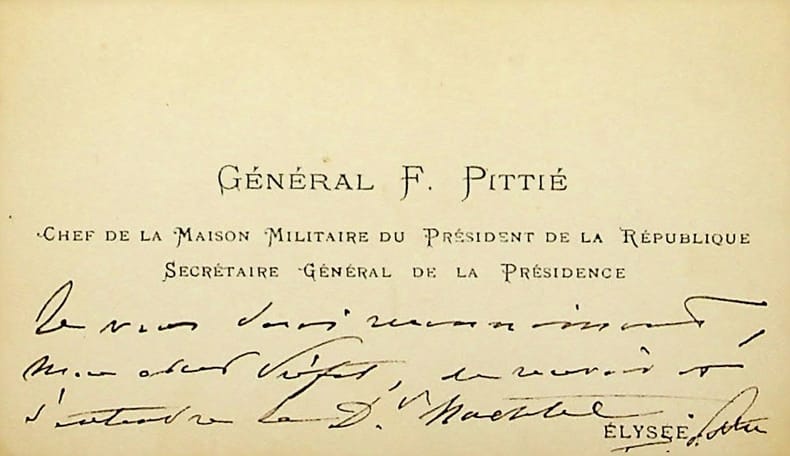 François Pittié (1829-1886), militaire, général, écrivain. C.A.S., sd, 3 lignes. « Je vous serai reconnaissant, mon cher préfet, de recevoir et d'entendre le Dr Nachtel. F Pittié » (provenant des papiers du Dr Nachtel). [464]
