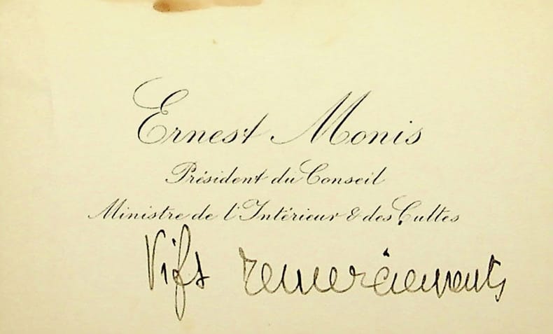 Ernest Monis (1846-1929), avocat, homme politique, sénateur, ministre, président du conseil. C.A., sd, 2 mots. « Vifs remerciements ».