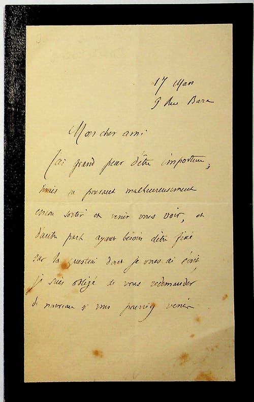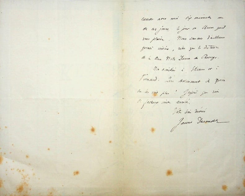 James Darmesteter (1849-1894), philologue, orientaliste, iranologue. L.A.S., 17 mars, 1p 1/2 in-8. « Mon cher ami, J'ai grand peur d'être importun mais ne pouvant malheureusement encore sortir et venir vous voir, et d'autre part ayant besoin d'être fixé sur la question dont je vous ai écrit, je suis obligé de vous redemander de nouveau si vous pouviez venir causer avec moi dix minutes un de ces jours, le jour et l'heure qu'il vous plaira. nous sommes d'ailleurs quasi voisins, rien que la distance de la rue Notre Dame des Champs. Mes amitiés à Etienne et à Fernand. Que deviennent-ils qu'on ne les voit plus ? J'espère que rien de fâcheux n'est arrivé. Votre bien dévoué James Darmesteter ». Peu commun. [465]