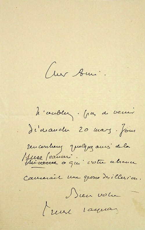 Ernest Raynaud (1864-1936), poète, écrivain. L.A.S., sd [1921], 1p in-8. Probablement à Maurice Landeau, éditeur de la revue Belles-lettres. « Cher ami, n'oubliez pas de venir dimanche 20 mars. Vous rencontrerez quelques amis de la [barré : Minerve] Muse française à qui votre absence causerait une grosse désillusion. Bien votre. Ernest Raynaud ». [465]