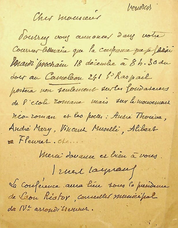 Ernest Raynaud (1864-1936), poète, écrivain. L.A.S., 14 décembre 1923, 1p in-12. Au poète et journaliste Paul Fuchs (1864-1940). Il lui demande d'annoncer sa conférence du 18 décembre au Caméléon « non seulement sur les fondateurs de l'école romane mais sur le mouvement néo-roman et les poètes : André Thérive, André Mary, Vincent Muselli, Alibert, Fleuret, etc. ». Sous la présidence de Léon Riotor. [465]