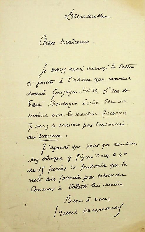 Lettre autographe signée de Félix Fénéon adressée à Gabriel Mourey, 18 lignes à l'encre noire, traces de pliure inhérentes à la mise sous pli de la lettre. Témoin et acteur privilégié de son époque, le critique d'art et collectionneur Félix Fénéon aide l'auteur Gabriel Mourey dans sa quête pourretrouver la correspondance de Paul Adam avec Maurice Barrès : "Le romancier et occultiste Paul Adam fut, comme vous savez, très lié à Maurice Barrès. (Candidats boulangistes dans deux circonscriptions lorraines contiguës, il firent fraternellement une campagne électorale et journalistique à laquelle leur amitié ne survécut guère.)Comment retrouver tous les papiers de Paul Adam, mort il y a une vingtaine d'années ? Mme Paul Adam vit-elle encore. - je n'en sais rien. Mais il est probable que vive une de ses soeurs, veuve depuis quelques trois ans de ce L. Cappielloauteur de tant d'affiches, - peintre elle aussi (et, de plus, fort sourde). Leur demeure était 8 rue Lechatelier, XVIIe. Par Mme L. Cappiello vous retrouverez peut-être des papiers barrésiens laissés par Paul Adam. Pour le cas où vous chercheriez dans cette direction, je note que que j'ai été en excellents termes avec toute la famille et que vous pouvez donc user de mon nom à votre gré." Personnalité majeure de l'Avant-garde, Fénéon avait le talent de débusquer les plus grands artistes. Cet étrange dandy volontairement discret, fit le vude servir quasi religieusement tout ce qui dans l'art forme une nouvelle sensibilité.Défenseur des néo-impressionnistes Seurat et Signac, ami de Mallarmé et de Camille Pissaro, de Paul Adam, Gustave Kahn, anarchiste puis communiste, directeur d'une douzaine de petites revues, il publia des uvres neuves telles les Illuminationsde Rimbaud, lePaludesd'André Gide,Dédalusde James Joyce. Prolifique journaliste, il écrivit partout et ne signa pas ses articles ou emprunta même des pseudonymes extravagants comme Gil de Bache, Porphyre Kalouguine, voire Thérèse ou Louise. Rare lettre de Félix Fénéon sur ses contemporains. Nous y joignions une lettre autographe signée de Fanny Fénéon, femme de Félix Fénéon, datée du 30 décembre 1941 alors que son mari était malade et alité, 10 lignes à l'encre noire, traces de pliure inhérentes à la mise sous pli de la lettre. "Mon mari gravement malade est dans l'impossibilité de recevoir quelqu'un. Si la difficultéque vous désirez lui remettre peut se résoudre par lettre, veuillez lui dire ce dont il s'agit. Une réponse immédiate vous montrera que malgré ses 80 ans, il est tout à votre disposition. [...]" - Photographies et détails sur www.Edition-Originale.com -