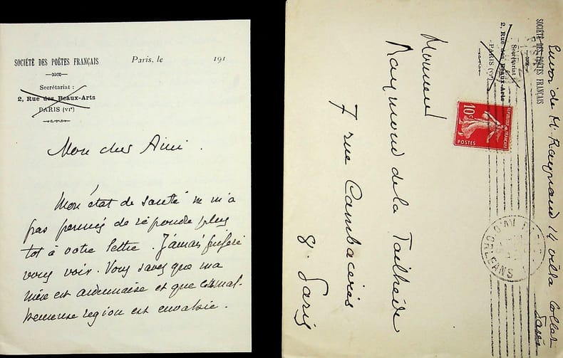 Ernest Raynaud (1864-1936), poète, écrivain. L.A.S., sd [après 1925], 1p in-8. « Mon cher ami, Le dernier poème que je vous ai adressé avait un grave défaut : celui de ne pas être d'une contexture uniforme ni d'un grain assez serré d'un bout à l'autre. J'ai cru bien faire en le divisant de la façon dont vous pourrez vous rendre compte en jetant les yeux sur le manuscrit ci-joint, corrigé. D'un poème, j'en fais deux. Les deux pièces d'un ton différent retrouvent ainsi l'unité de style qui leur manquait. Croyez à mes affectueux sentiments. Ernest Raynaud ». On joint une enveloppe autographe du 21 novembre 1912 adressée à Raymond de La Tailhède, qui était jointe à ce document. Peut-être que la lettre est aussi adressée à La Tailhède. [465]