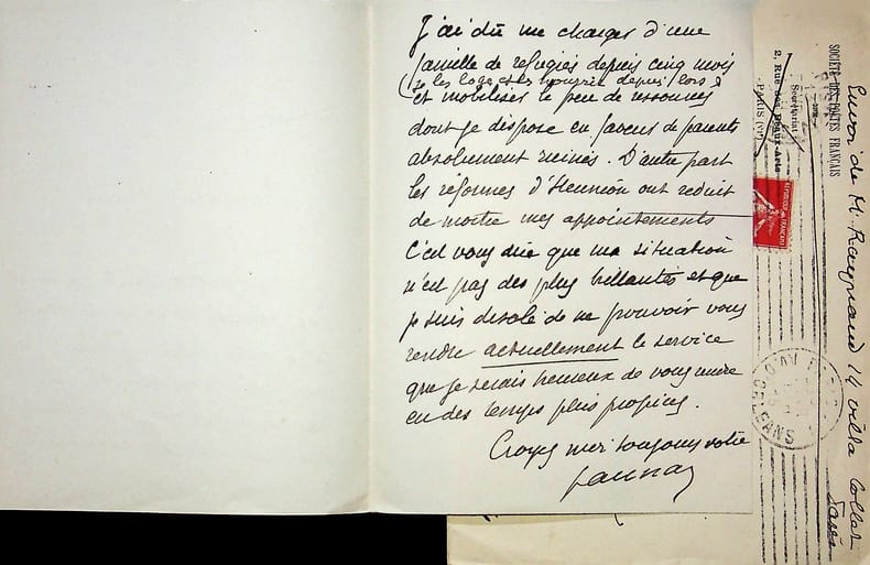 Ernest Raynaud (1864-1936), poète, écrivain. L.A.S. + enveloppe, 13 février 1915, 2p in-12. Entête de la Société des Poètes français dont il était vice-président. Au poète Raymond de La Tailhède (1867-1938). Belle lettre pendant la guerre, expliquant qu'il ne peut lui rendre service car ses appointements sont réduits de moitié et, étant ardennais par sa maman, il doit se charger d'une famille de réfugiés depuis 5 mois. [465]