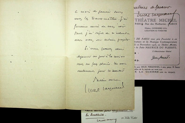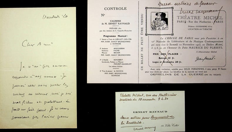 Ernest Raynaud (1864-1936), poète, écrivain. L.A.S., vendredi 20 [janvier 1922], 2p in-8. Au poète Raymond de La Tailhède (1867-1938). « Cher Ami, je n'ai pas encore répondu à vos voeux. Je pensais aller vous porter les miens en retour mais je suis mal fichu et grelottant. Le froid me fait peur. Je ne veux pourtant pas laisser passer ce mois de janvier sans vous les transmettre. J'ai furieuse envie de vous voir tant j'ai sujet de m'entendre avec vous sur certains projets. Si vous pouvez venir déjeuner un jour à la maison, vous me ferez plaisir. Un mot seulement pour m'avertir. Bien votre. Ernest Raynaud ». On joint une C.A.S. et un prospectus, avec notes A.S., les deux pour donner deux « entrées de faveur » pour une « matinée de littérature et de musique contemporaines » en l'honneur de Maurice du Plessys le 10 novembre 1923 (qui mourra deux mois plus tard). Joli ensemble. [465]