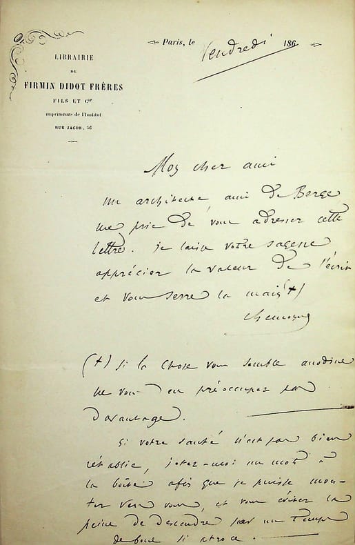 André Lemoyne (1822-1907), poète, écrivain. L.A.S., sd [vendredi, 186.], 1p in-8. Entête de la librairie Firmin Didot, où il était chef de publicité. Probablement au journaliste Jules Castagnary (1830-1888). « Mon cher ami, Un architecte, ami de Berge, me prie de vous adresse cette lettre je laisse votre sagesse apprécier la valeur de l'écrin et vous serra la main. Lemoyne. Si la chose vous semble anodine, en vous en préoccupez pas davantage. Si votre santé n'est pas bien rétablie, jetez-moi un mot à la boite afin que je puisse monter vers vous, et vous éviter la peine de descendre par un temps de boue si atroce ». [466]