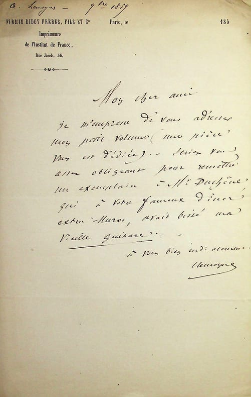 André Lemoyne (1822-1907), poète, écrivain. L.A.S., sd [novembre 1859 selon une note], 1p in-8. Entête de la librairie Firmin Didot, où il était chef de publicité. Au journaliste Jules Castagnary (1830-1888). « Mon cher ami, Je m'empresse de vous adresser mon petit volume (une pièce vous est dédiée). Seriez-vous assez obligeant pour remettre un exemplaire à Mr Duchêne qui à votre fameux dîner extra muros, avait brisé ma vieille guitare. À vous bien cordialement. Lemoyne ». En effet, le 2e poème de son recueil Stella Maris, titré Renoncement, est dédié à Castagnary. Ce recueil est publié par Didot en 1860. Il était donc déjà imprimé en novembre 1859. La Vieille Guitare est le titre d'un poème de Lemoyne. [466]