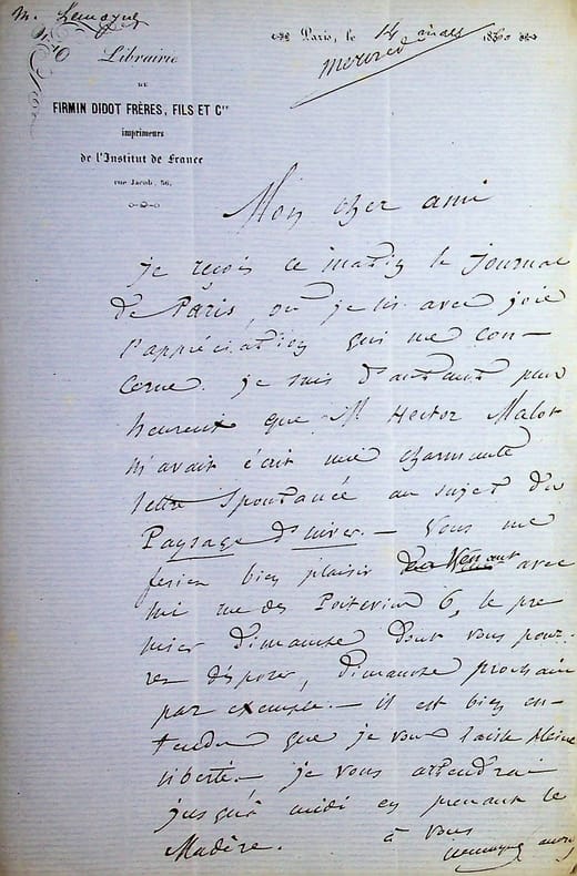 André Lemoyne (1822-1907), poète, écrivain. L.A.S., Paris, 14 mars 1860, 1p in-8. Entête de la librairie Firmin Didot, où il était chef de publicité. Probablement au journaliste Jules Castagnary (1830-1888). « Mon cher ami, Je reçois ce matin le journal de Paris, où je lis avec joie l'appréciation qui me concerne. Je suis d'autant plus heureux que M. Hector Malot m'avait écrit une charmante lettre spontanée au sujet de Paysage d'hiver [un poème]. Vous me feriez bien plaisir en venant avec lui rue des Poitevins 6, le premier dimanche dont vous pourrez disposer, dimanche prochain par exemple. Il est bien entendu que je vous laisse pleine liberté. Je vous attendrai jusqu'à midi en prenant le Madère. A vous. Lemoyne (André) ». [466]