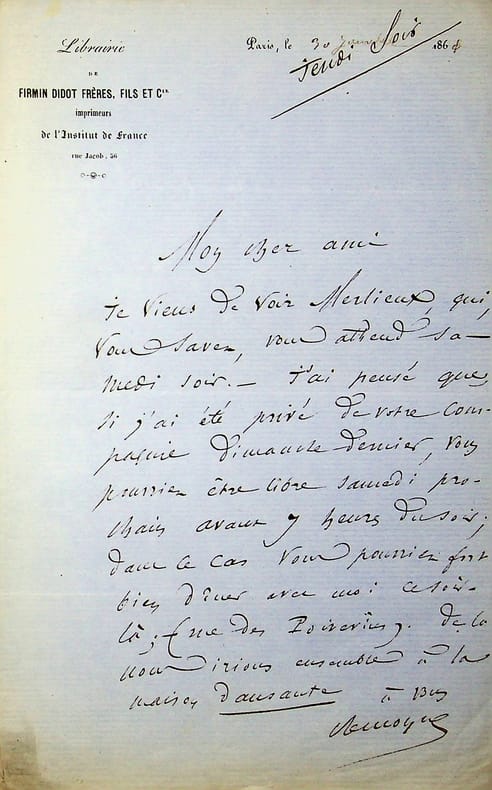 André Lemoyne (1822-1907), poète, écrivain. L.A.S., 30 janvier 1861, 1p in-8. Entête de la librairie Firmin Didot, où il était chef de publicité. Probablement au journaliste Jules Castagnary (1830-1888). « Mon cher ami, Je viens de voir Merlieux, qui, vous savez, vous attend samedi soir. J'ai pensé que si j'ai été privé de votre compagnie dimanche dernier, vous pourriez être libre samedi prochain avant 7 heures du soir. Dans ce cas, vous pourriez fort bien dîner avec moi ce soir-là (rue des Poitevins). De là, nous irions ensemble à la maison dansante. A vous. Lemoyne ». [466]