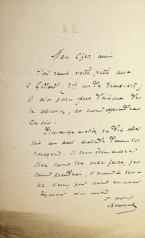 André Lemoyne (1822-1907), poète, écrivain. L.A.S., sd [vendredi, 186.], 1p in-8. Entête de la librairie Firmin Didot, où il était chef de publicité. Probablement au journaliste Jules Castagnary (1830-1888). « Mon cher ami, Un architecte, ami de Berge, me prie de vous adresse cette lettre je laisse votre sagesse apprécier la valeur de l'écrin et vous serra la main. Lemoyne. Si la chose vous semble anodine, en vous en préoccupez pas davantage. Si votre santé n'est pas bien rétablie, jetez-moi un mot à la boite afin que je puisse monter vers vous, et vous éviter la peine de descendre par un temps de boue si atroce ». [466]
