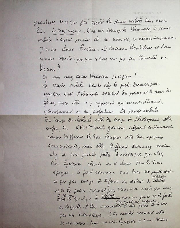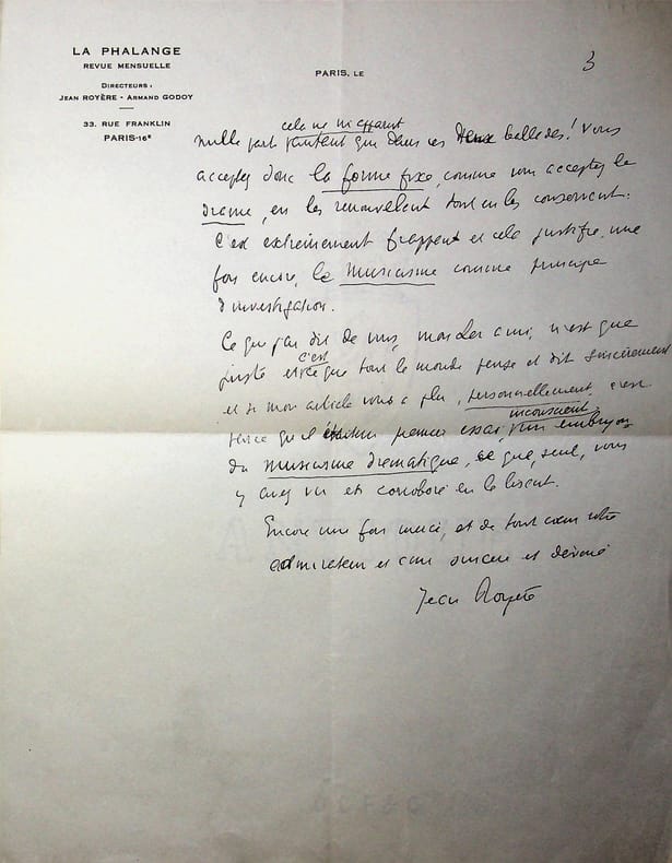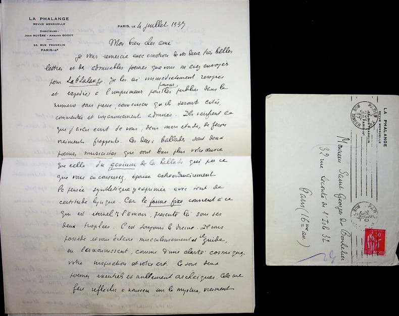 Jean Royère (1871-1956), poète, éditeur. L.A.S. + enveloppe, 4 juillet 1937, 3p in-4. Au poète Saint-Georges de Bouhelier (1876-1947). Il le remercie pour ses deux « admirables poèmes » pour La Phalange qui y seront publiées puis parle de l'oeuvre de Bouhelier, qualifiant ces deux poèmes de « poèmes essentiels et nullement archaïques ». Il disserte longuement sur la poésie, sur le Musicisme (du titre de son livre de 1929), de la pensée verbale, etc. Très belle lettre. [466]