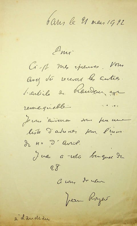 Jean Royère (1871-1956), poète, éditeur. L.A.S., Paris, 21 mars 1922, 1p in-8. A l'écrivain et journaliste Maurice Landeau. « Ami, Ci-joint mes épreuves. Vous avez dû recevoir les autres. L'article de Rande. est remarquable. Je vous enverrai sous peu une liste d'adresse pour l'envoi du n° d'avril. Je vais à votre banquet du 28. A vous de coeur. Jean Royère ». [466]