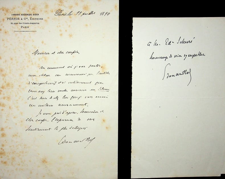 Edouard Rod (1857-1910), écrivain suisse. L.A.S., Paris, 11 juillet 1894, 1p in-8. Remerciements pour un article sur lui dans une revue. On joint un feuillet de dédicace à Edouard Schuré (livre non identifié). [467]