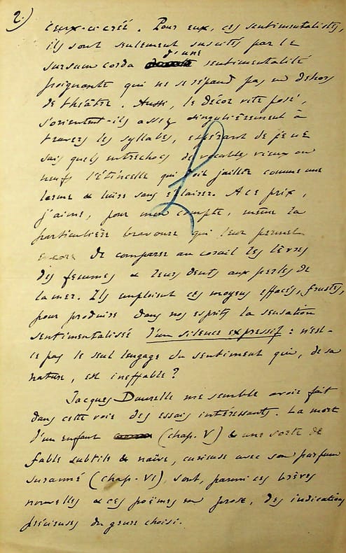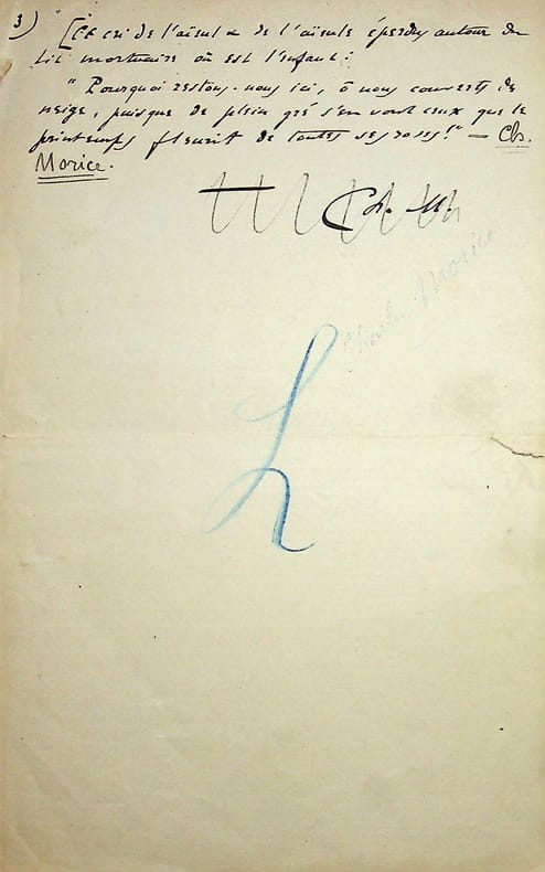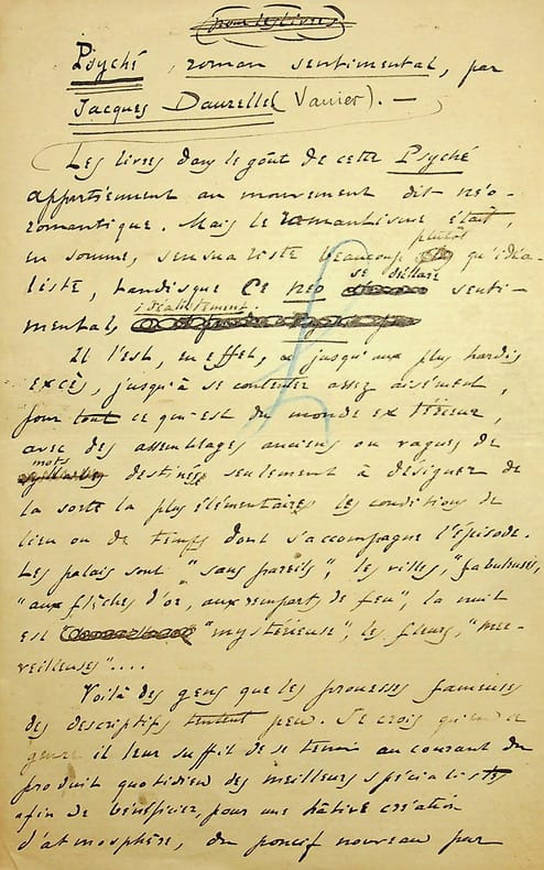 Charles Morice (1860-1919), poète, écrivain. Manuscrit A.S., [1895], 2p 1/2 in-8. Jolie critique de Psyché, roman sentimental, premier roman de Jacques Daurelle publié par Vanier en 1894. Elle a été publiée dans le Mercure de France de mars 1895 (p.365). Joli document. [467]