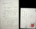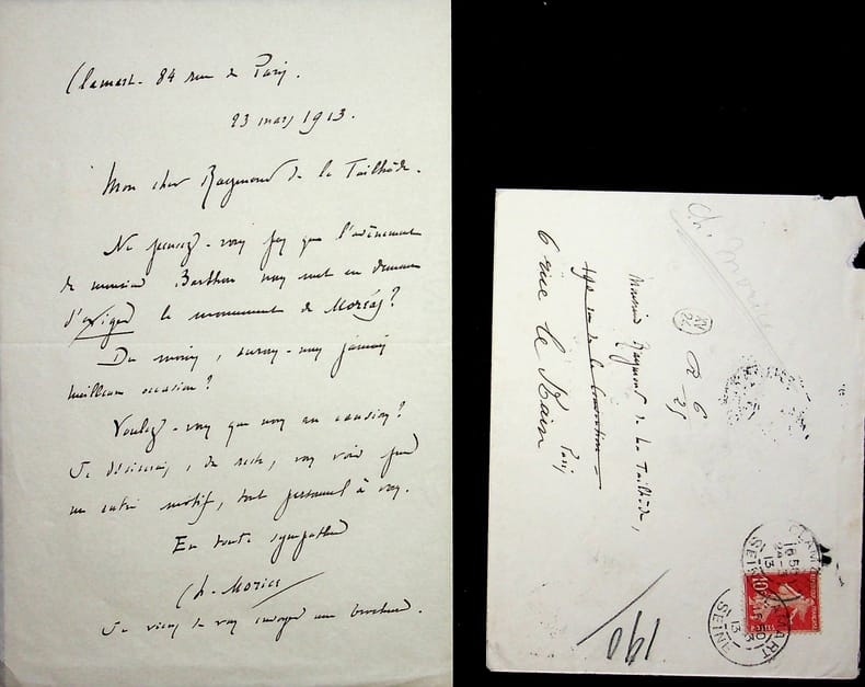 Charles Morice (1860-1919), poète, écrivain. L.A.S. + enveloppe, Clamart, 23 mars 1913, 1p in-8. Au poète Raymond de La Tailhède (1867-1938). « Mon cher Raymond de la Tailhède, Ne pensez-vous pas que l'avènement de monsieur Barthou nous met en demeure d'exiger le monument de Moréas ? Du moins, aurons-nous jamais meilleure occasion ? Voulez-vous que nous en causions ? Je désirerais, du reste, vous voir pour un autre motif, tout personnel à vous. En toute sympathie. Ch. Morice. Je viens de vous envoyer une brochure ». Jolie lettre. [467]